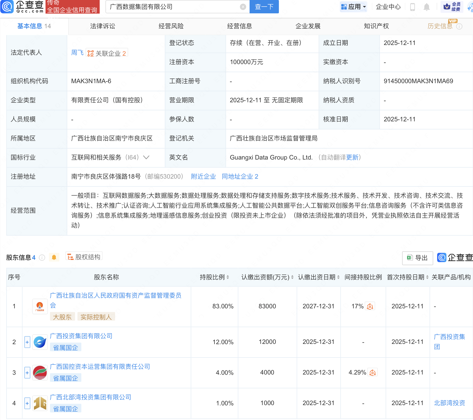 近日在线配资知识,广西数据集团有限公司成立,注册资本10亿元,经营范围包含:人工智能行业应用系统集成服务;人工智能公共数据平台;人工智能双创服务平台等。企查查股权穿透显示,该公司由广西壮族自治区人民政府国有资产监督管理委员会、广西投资集团有限公司等共同持股。