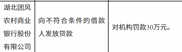 12月12日配资指数官网,国家金融监督管理总局黄冈监管分局行政处罚信息公开表显示,湖北团风农村商业银行股份有限公司因向不符合条件的借款人发放贷款被罚款30万元。